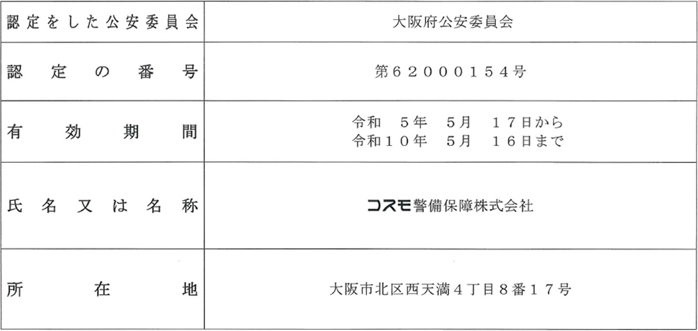 | 昭和47年11月 | 警備業開始許可を届出。大阪府公安委員会 第154号取得。 |